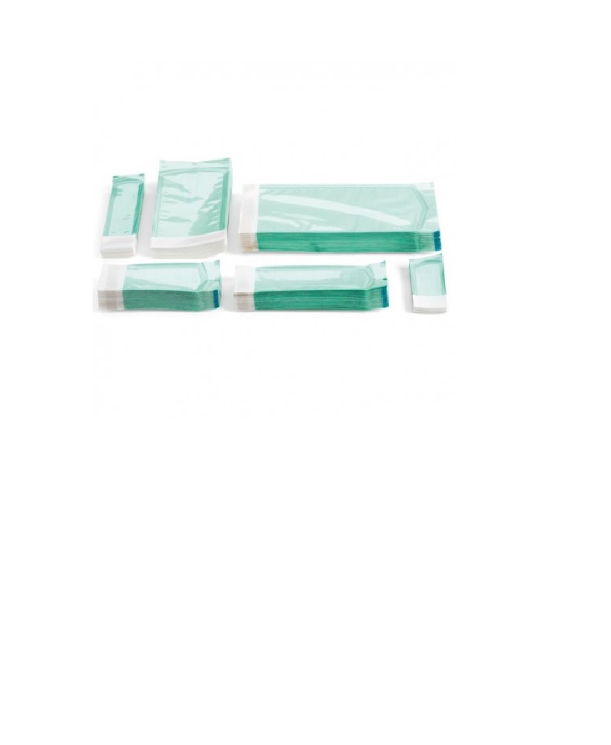 Buste piatte autosaldanti per la sterilizzazione in autoclave costituite da una pellicola trasparente di poliestere-polietilene verde accoppiato a carta medicale che permette la penetrazione del vapore e del gas durante la sterilizzazione.